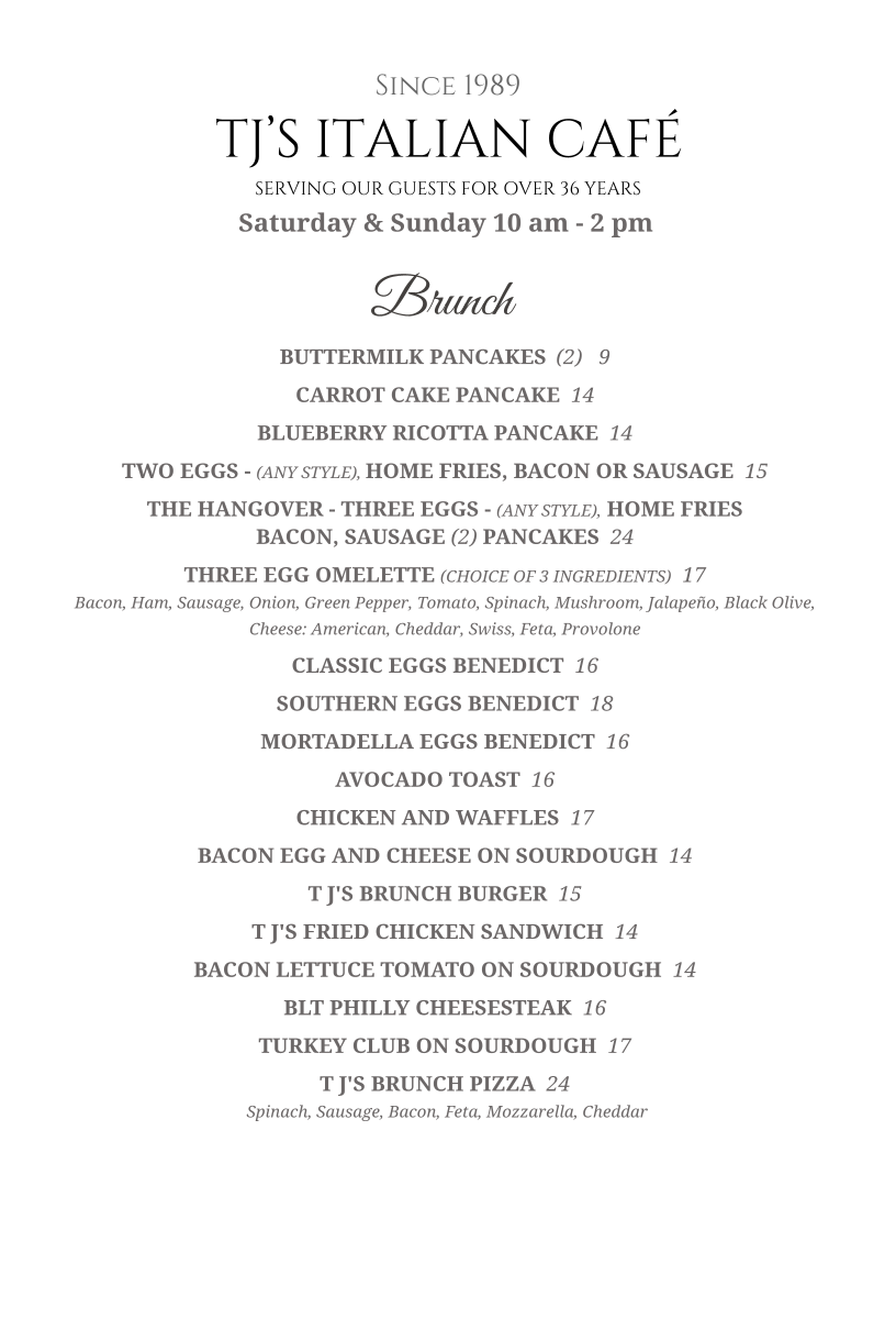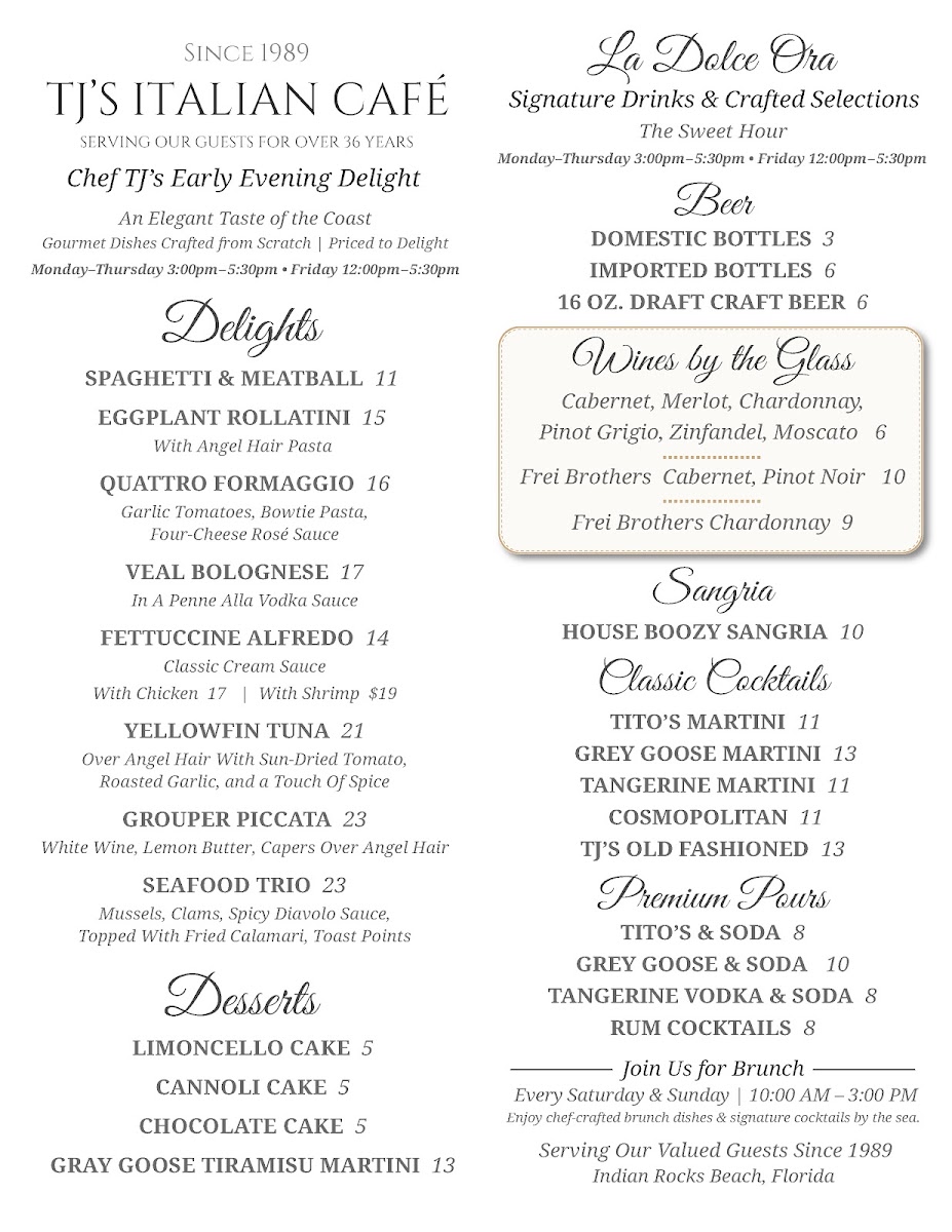 Welcome to TJ's Italian Cafe, a delightful culinary gem located at 1515 Gulf Blvd, Indian Rocks Beach, FL. This family-friendly restaurant specializes in authentic Italian cuisine, delivering a brunch experience that captivates all ages.